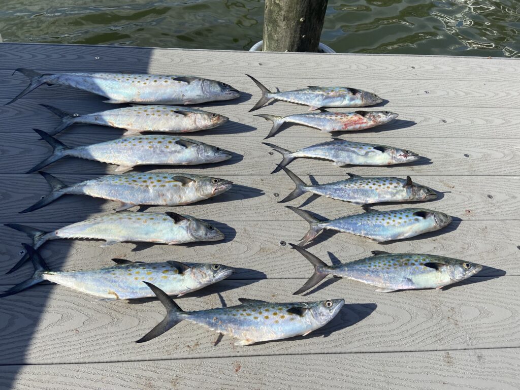 Beyond this, there’s not too much else to discuss other than speed. Run between 5 and 8 miles an hour and adjust the speed if needed based on the bluefish, which I mentioned above. Too slow and you’ll only get bluefish. Additionally, when those planer rods pop or the surface rods bend over with a bite, keep the boat in gear and start to reel in the fish. These fish can pull hooks and shake them super easily, so be gentle when reeling them. Now, you should know everything you need to get on the water and start trolling for Spanish mackerel. Good luck!